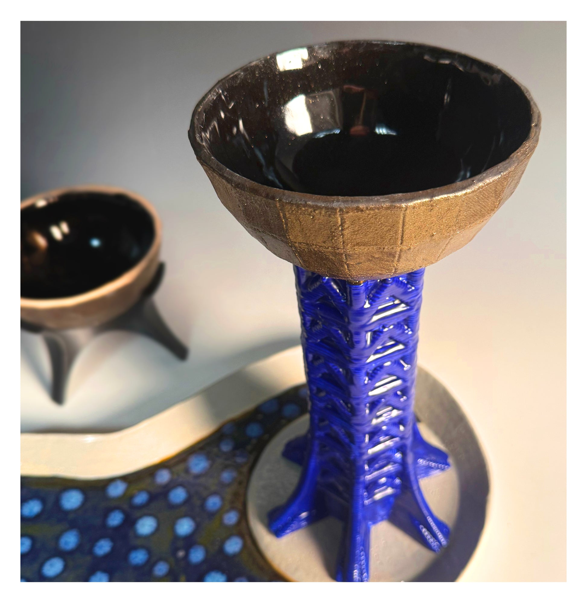 The design features a removable top half of the Sunsphere that doubles as a dipping bowl, resting on a custom 3D-printed stand for versatility in your party setup. Each piece is meticulously made by combining a variety of pottery methods including slip casting, 3d printing, and slab molding.